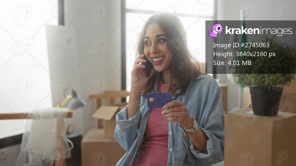 Young hispanic woman talking on phone inside new home holding credit card with joy surrounded by moving boxes and potted plant under soft natural light in cozy living room. - Kraken Images