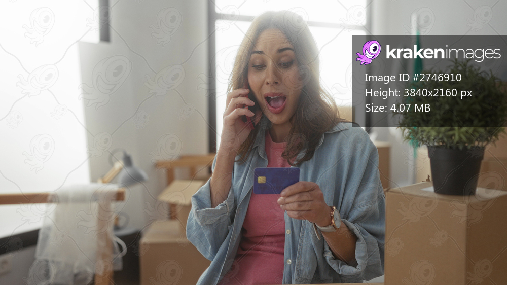 Young hispanic woman talking on phone inside new home holding credit card with joy surrounded by moving boxes and potted plant under soft natural light in cozy living room. - Kraken Images