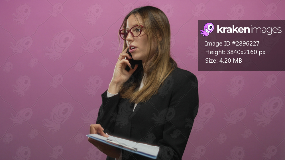 Young hispanic woman talking on phone while reading a clipboard in pink studio, wearing red glasses and black blazer; concentration.