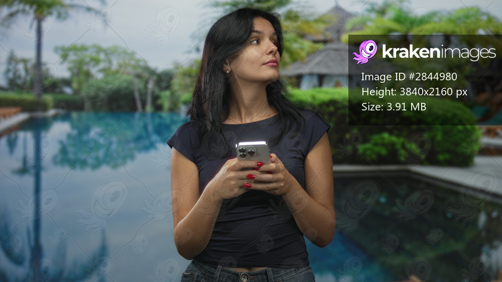 Young hispanic woman tapping smartphone by tropical resort pool under palm trees in bright daylight; serenity.