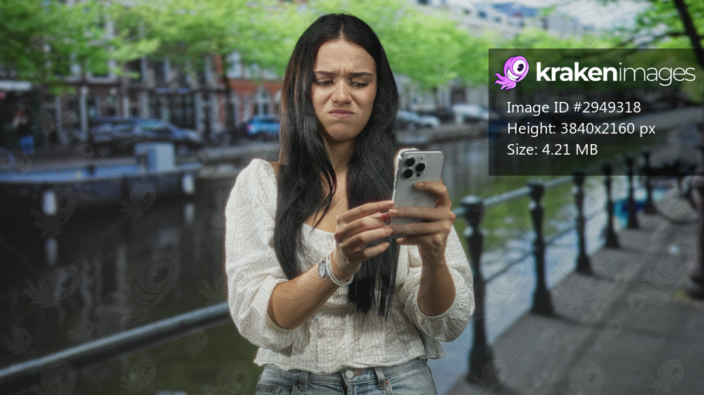 Young hispanic woman tapping smartphone with displeased grimace on canal street, pointing finger at screen; frustration.