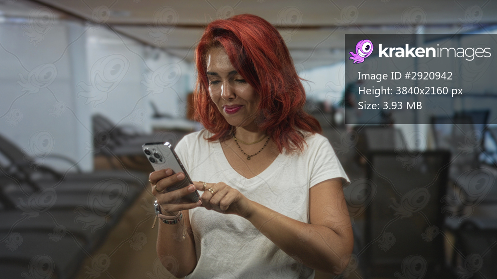 Young hispanic woman tapping smartphone with finger while standing in ship lounge building in a white t shirt; concentration.