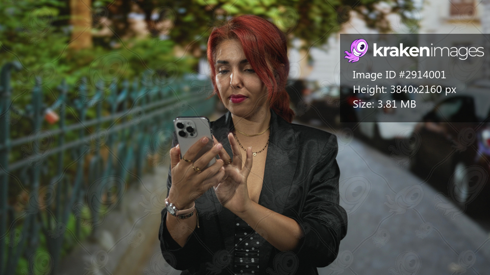 Young hispanic woman tapping smartphone screen with fingers on cobblestone city street wearing black blazer and rings; digital focus.