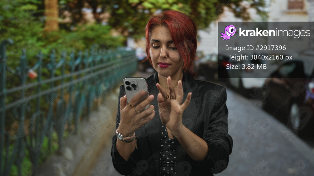 Young hispanic woman tapping smartphone screen with fingers on cobblestone city street wearing black blazer and rings; digital focus.