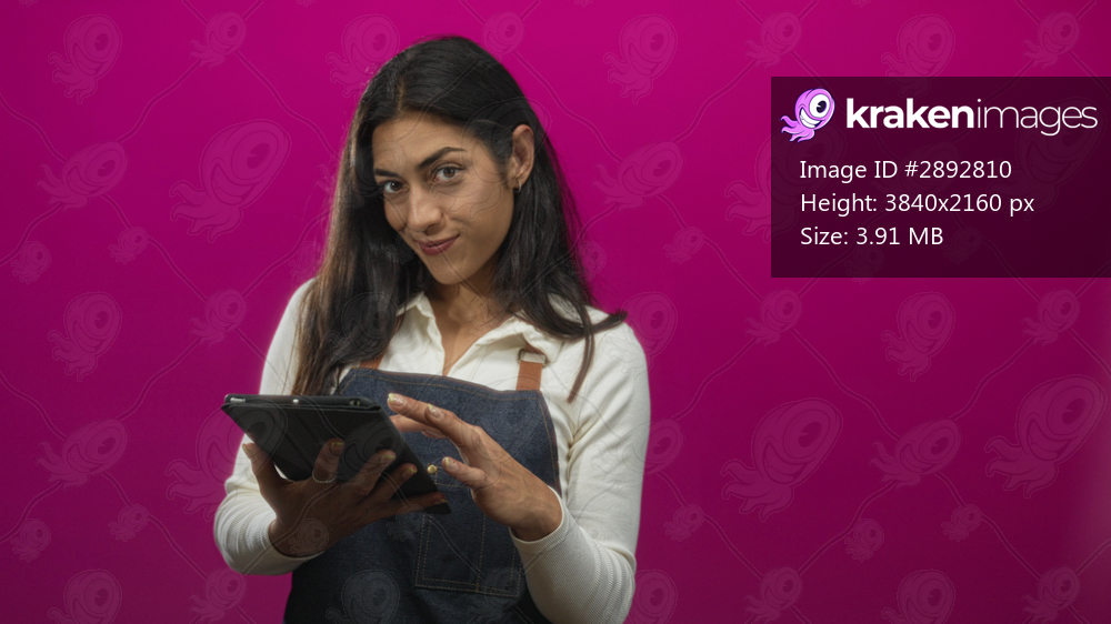 Young hispanic woman taps tablet screen with fingers while holding the tablet and checking content, wearing denim apron in magenta studio; focused.