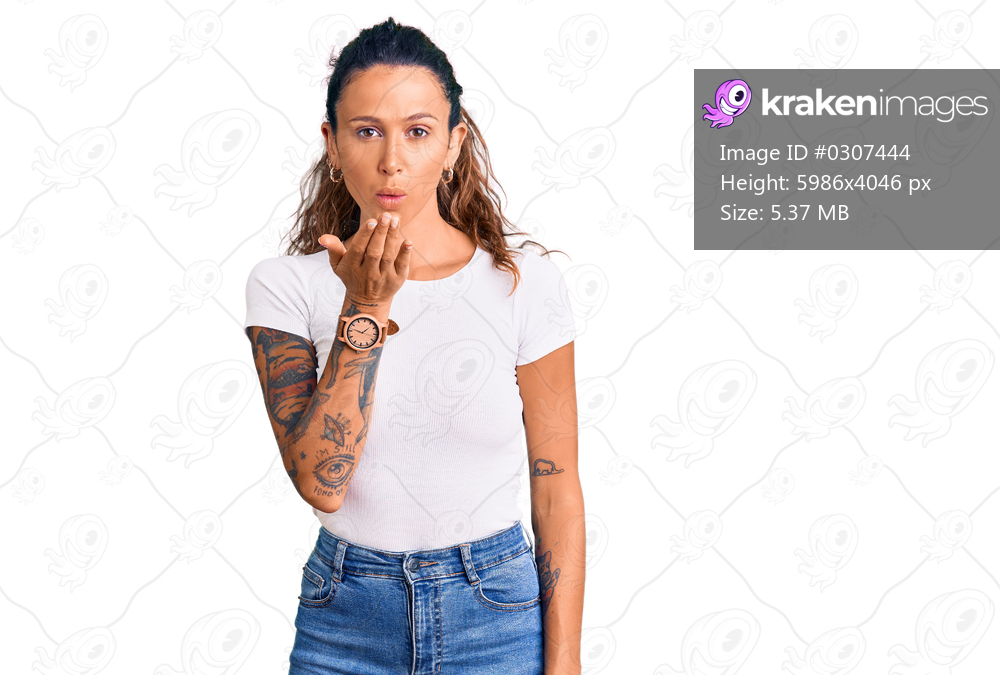 Young hispanic woman with tattoo wearing casual white tshirt looking at the camera blowing a kiss with hand on air being lovely and sexy. love expression. - Kraken Images