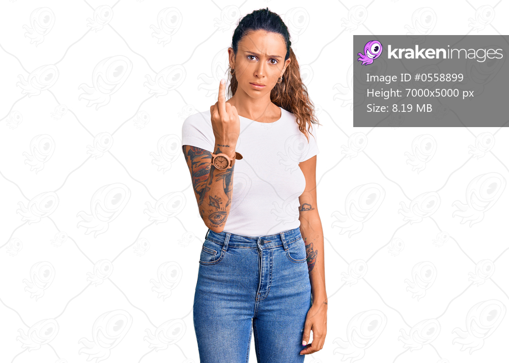 Young hispanic woman with tattoo wearing casual white tshirt showing middle finger, impolite and rude fuck off expression