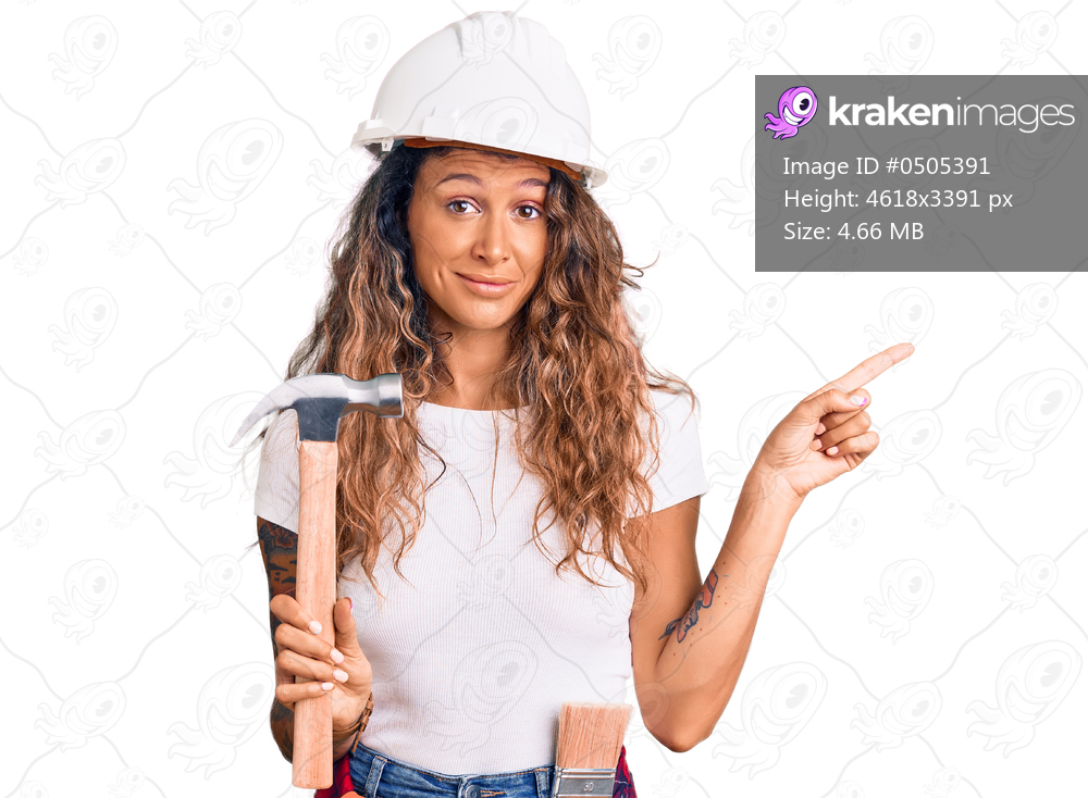Young hispanic woman with tattoo wearing hardhat and builder clothes holding hammer smiling happy pointing with hand and finger to the side