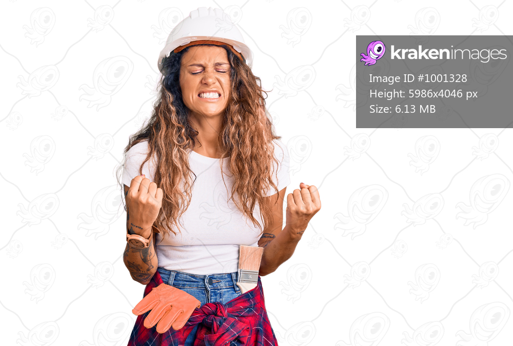 Young hispanic woman with tattoo wearing hardhat and builder clothes very happy and excited doing winner gesture with arms raised, smiling and screaming for success. celebration concept. - Kraken Images