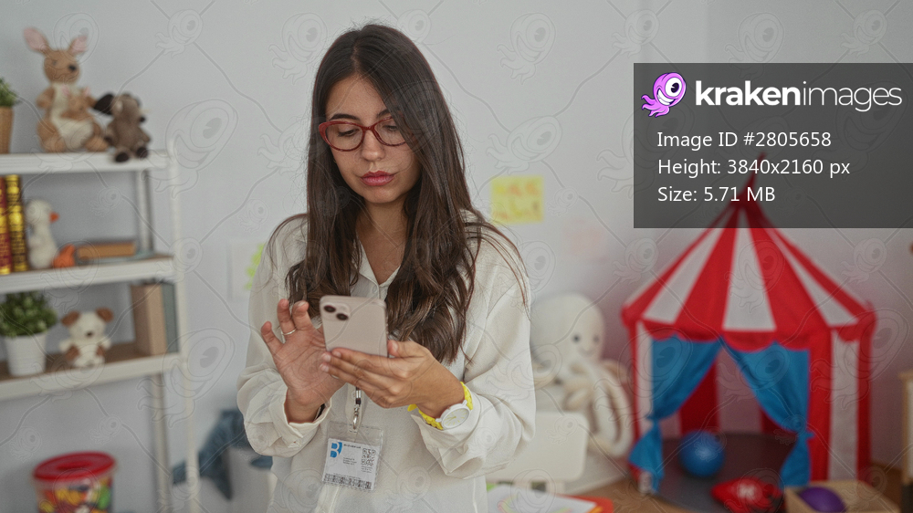 Young hispanic woman teacher using a smartphone in a colorful kindergarten classroom filled with toys, showcasing a modern educational environment indoors. - Kraken Images