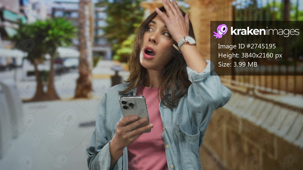 Young hispanic woman texting on smartphone in city street showing mixed emotions amidst urban backdrop