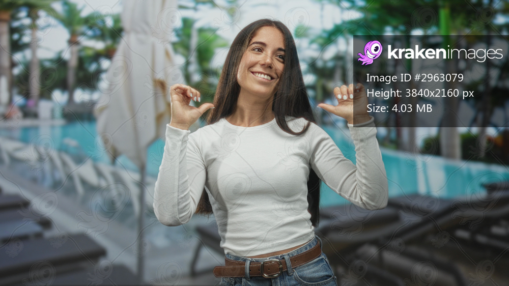 Young hispanic woman thumbs pointing to chest at resort pool wearing white long sleeve top and jeans by lounge chairs and umbrellas; confidence.