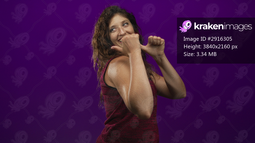 Young hispanic woman with thumbs to chest wearing a sleeveless tanktop in a purple studio; playful confidence.