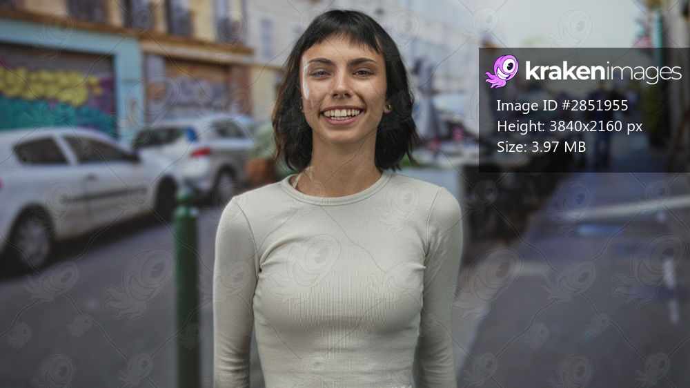 Young hispanic woman tilting her head back with eyes closed and smiling on a busy urban street; serenity.