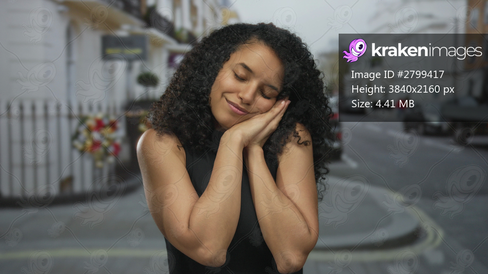 Young hispanic woman tilts head on folded hands for sleep gesture on urban street lined with buildings; restful calm.