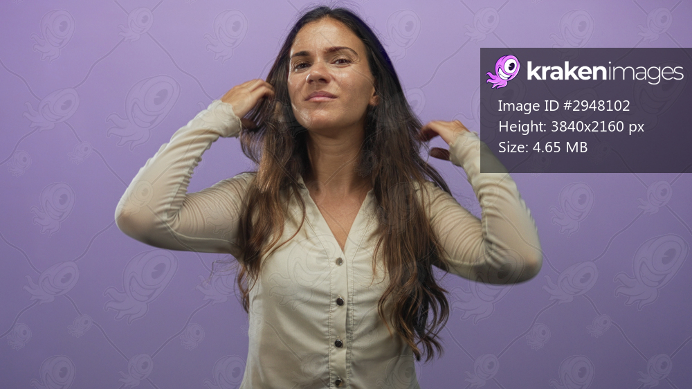 Young hispanic woman touches and adjusts long dark hair with both hands in a purple studio, neutral expression; thoughtful grooming.
