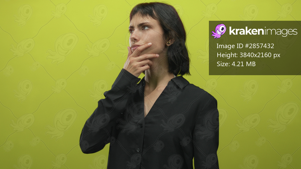 Young hispanic woman touches chin in yellow studio with slight frown and direct gaze; contemplation.
