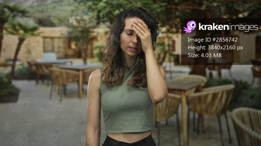 Young hispanic woman touches forehead with hand in restaurant terrace building outdoors at sunset; stress moment reflection pause.