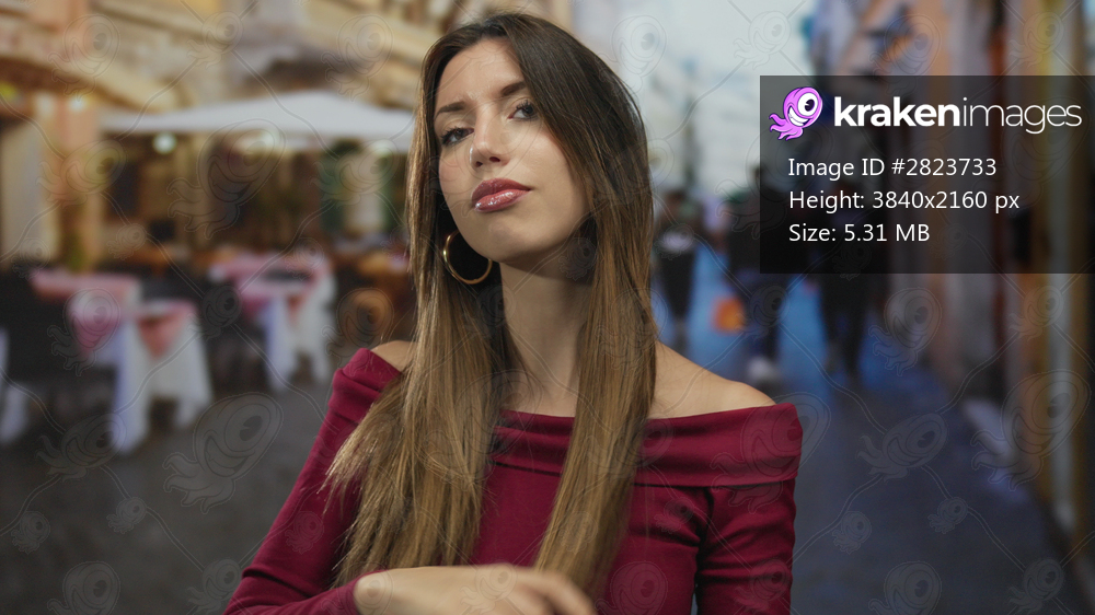 Young hispanic woman touches hair with hand on shoulder at street cafe terrace under sunlight; serenity.