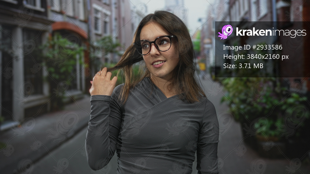 Young hispanic woman touches hair while smiling on a narrow cobblestone city street wearing glasses and gray top; confidence calm.