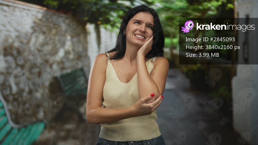 Young hispanic woman touching cheek for toothache in a sunlit street with stone wall and green bench; pain.