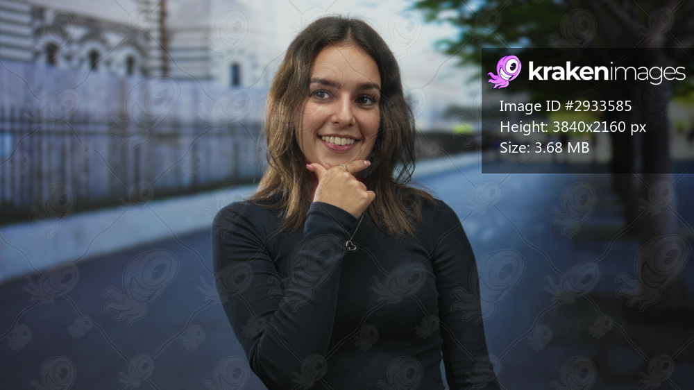 Young hispanic woman touching chin with fingers and smiling at camera while standing on a city street near fence and tree; happiness youth friendly moment. - Kraken Images