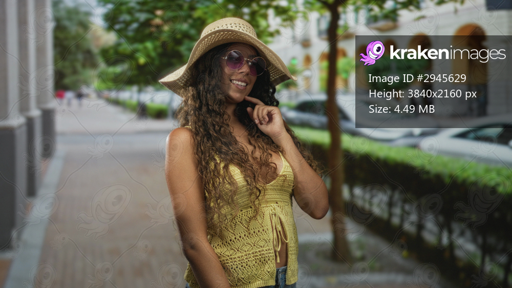 Young hispanic woman touching chin with hand, wearing sunhat, sunglasses and yellow crochet top on a city street; summer confidence.
