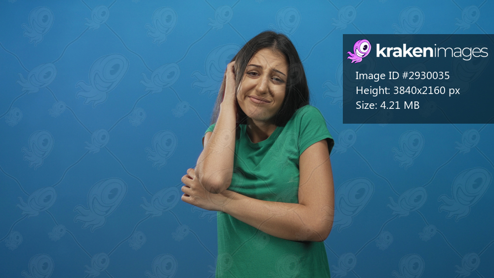 Young hispanic woman touching ear with arm crossed in studio against a bright blue wall; mild discomfort.