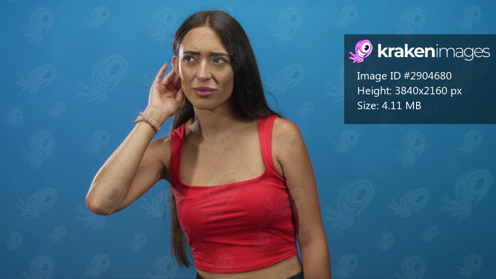 Young hispanic woman touching ear with hand in studio blue backdrop wearing red crop top and watch, looking puzzled; listening concern.