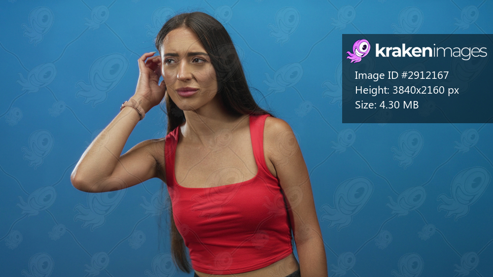 Young hispanic woman touching ear with hand in studio blue backdrop wearing red crop top and watch, looking puzzled; listening concern.