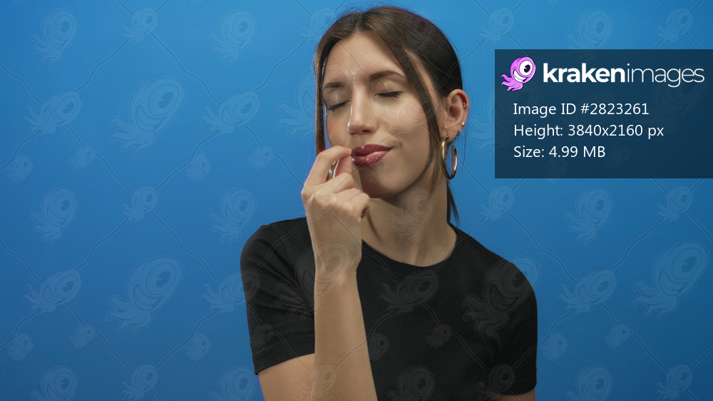 Young hispanic woman touching lips with finger in a blue studio; silence calm introspection mindfulness.