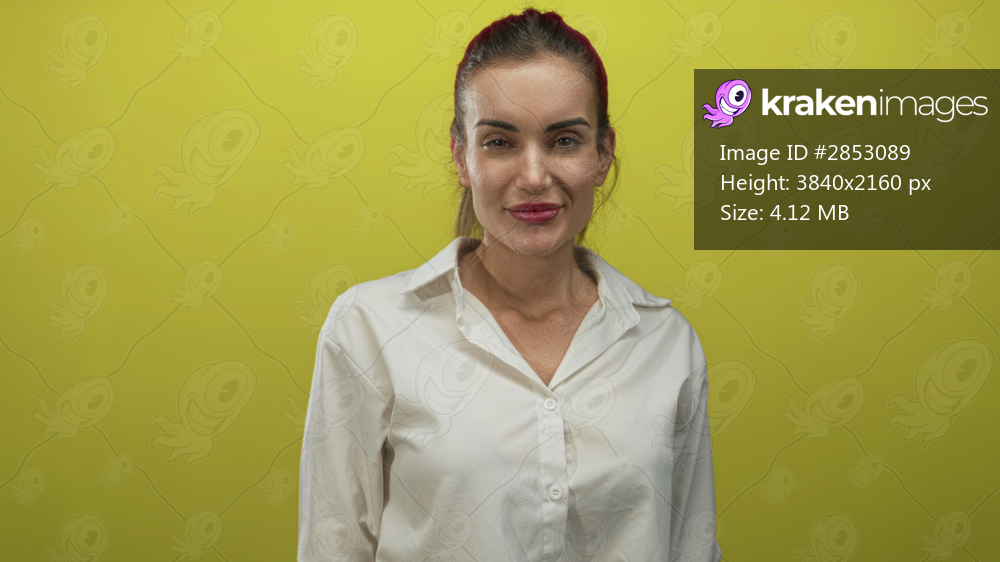 Young hispanic woman turns head to side showing face and profile in a studio against a yellow wall; curiosity.