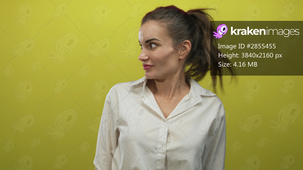 Young hispanic woman turns head to side showing face and profile in a studio against a yellow wall; curiosity.