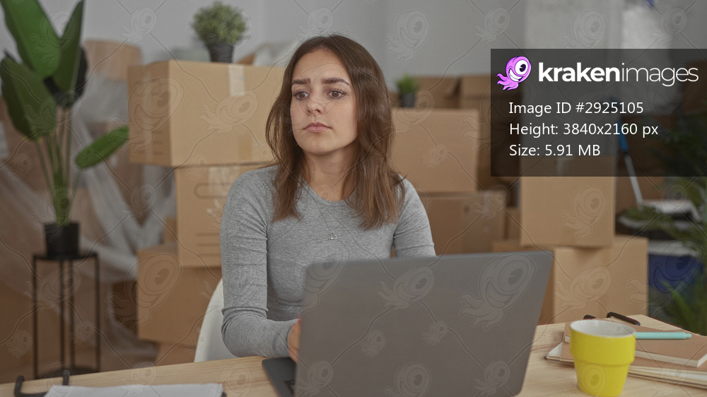Young hispanic woman typing on laptop at a table amid cardboard moving boxes in building during unpacking; relocation planning stressed.