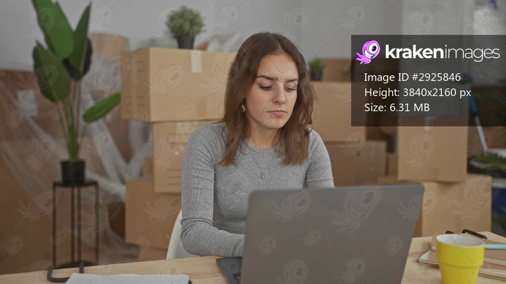 Young hispanic woman typing on laptop at a table amid cardboard moving boxes in building during unpacking; relocation planning stressed.