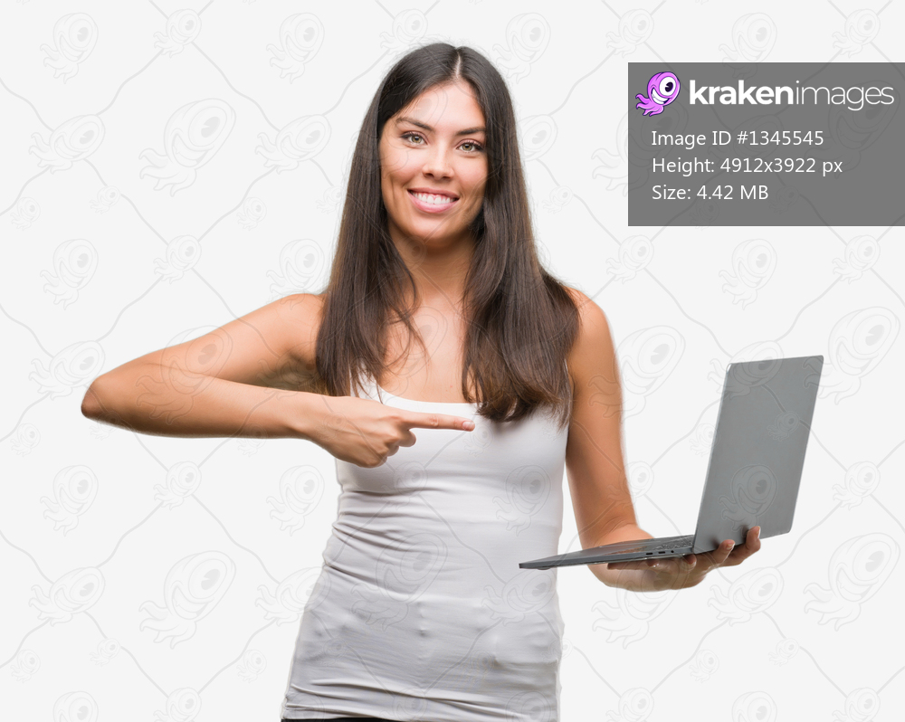 Young hispanic woman using computer laptop very happy pointing with hand and finger
