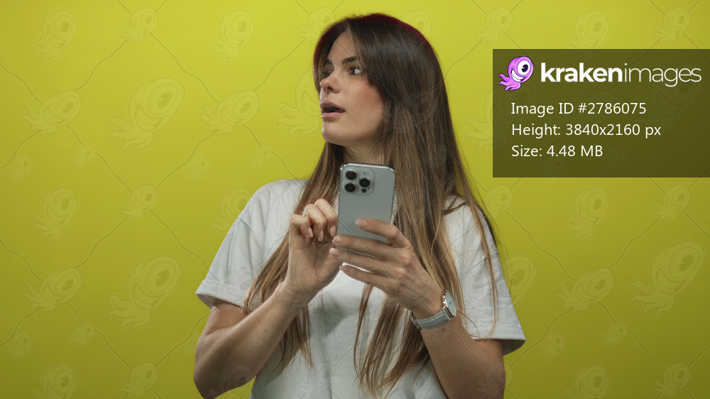 Young hispanic woman using smartphone against vibrant yellow background wearing casual white tshirt, absorbed in technology interaction