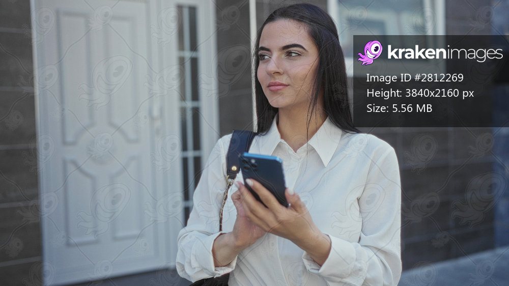 Young hispanic woman using smartphone on urban street in daylight showcasing modern technology and outdoor lifestyle, emphasizing communication and youth in city environment. - Kraken Images