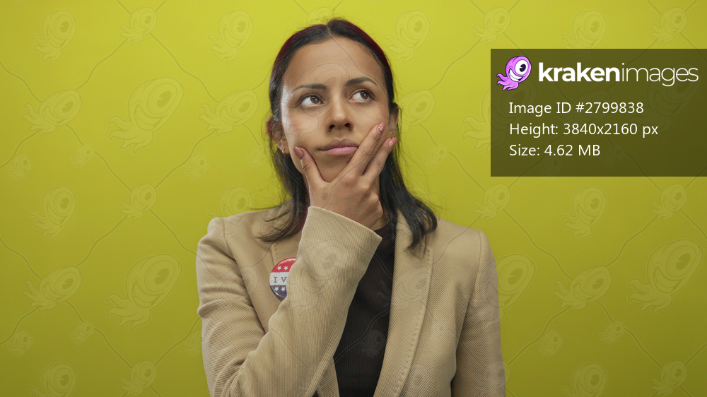 Young hispanic woman with voting badge pondering over isolated yellow background.
