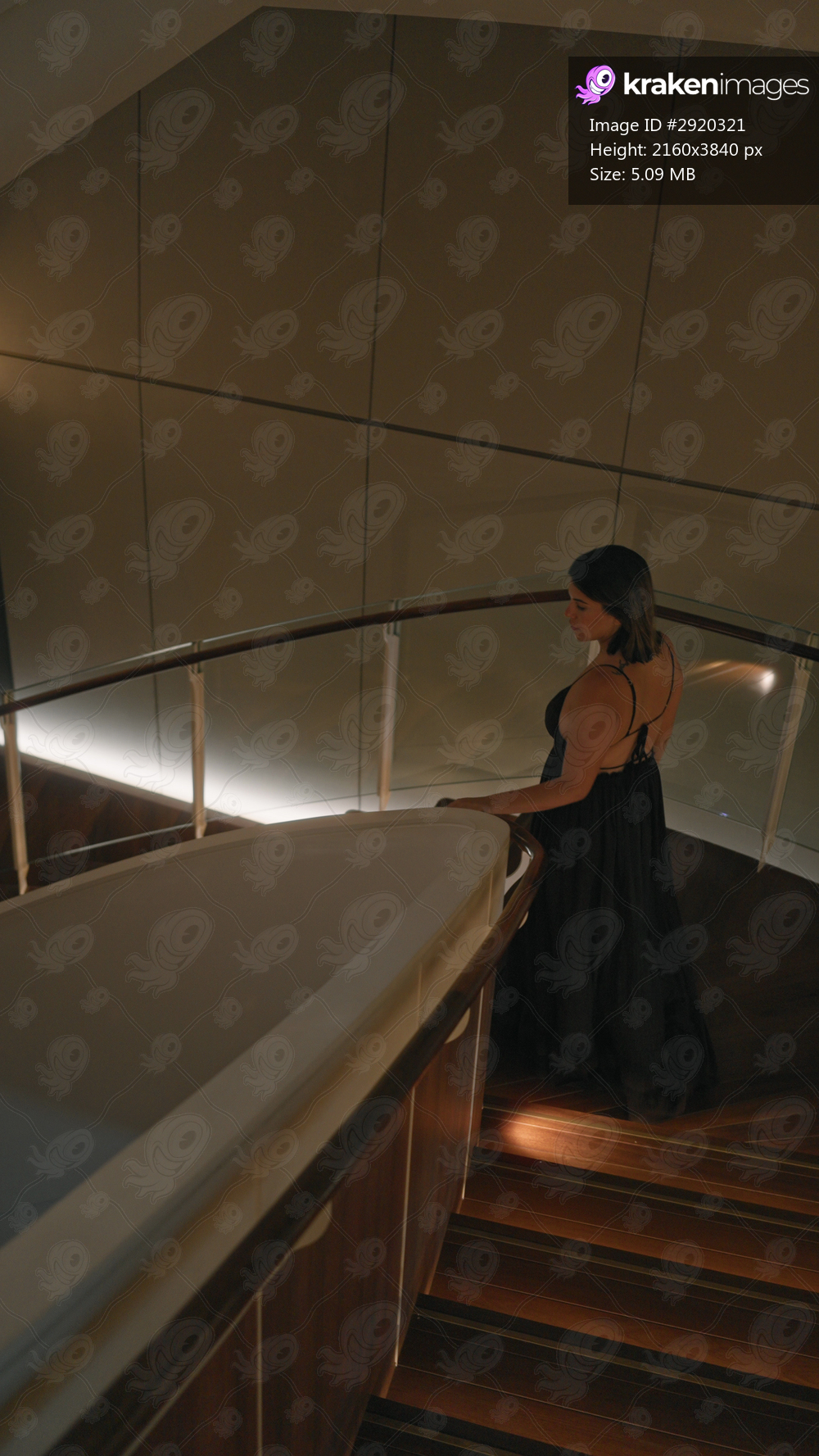 Young hispanic woman walking down a curved wooden staircase in building holding the glass railing and wearing a black dress; contemplation.