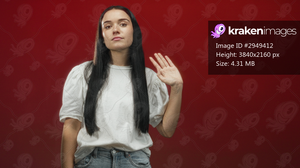 Young hispanic woman waving hand in studio with red wall, white t shirt and denim jeans visible; calm confidence.