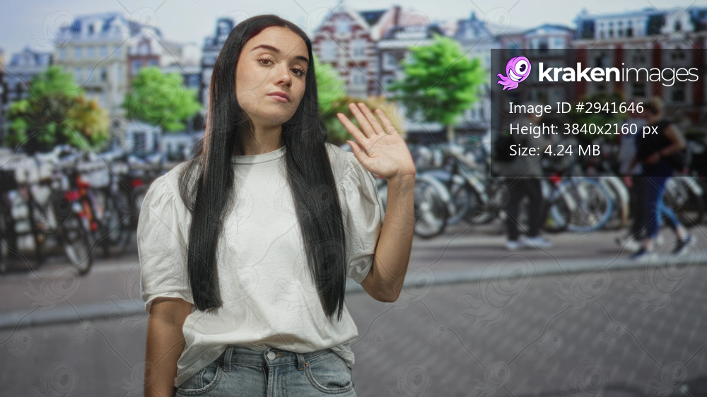 Young hispanic woman waving hand with palm outward on a european street lined with parked bicycles and brick townhouses; dismissal urban solitude.