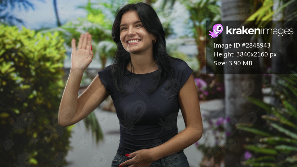 Young hispanic woman waving slender hand in busy street at midday under clear blue sky; happy greeting.