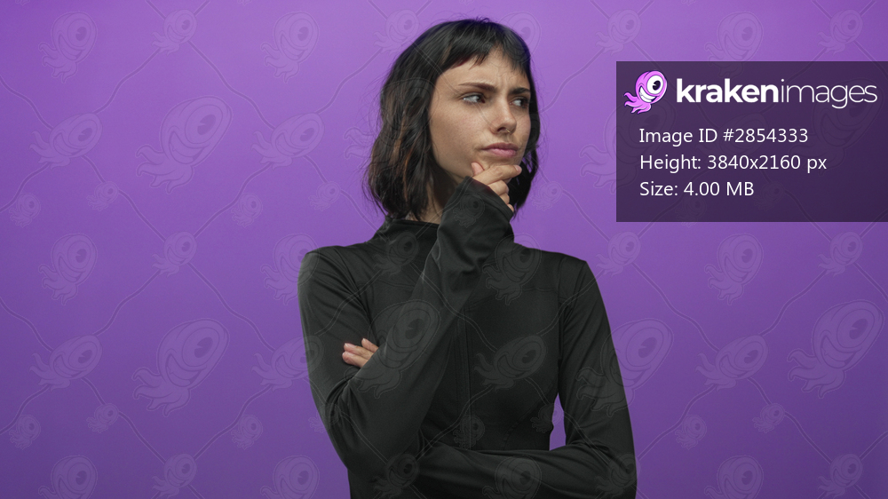 Young hispanic woman wearing a black lightweight sportswear jacket touches chin with hand in studio setting; thinking.
