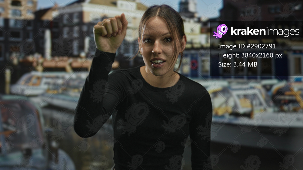 Young hispanic woman wearing a black top with fist raised on street by canal in amsterdam; determination.