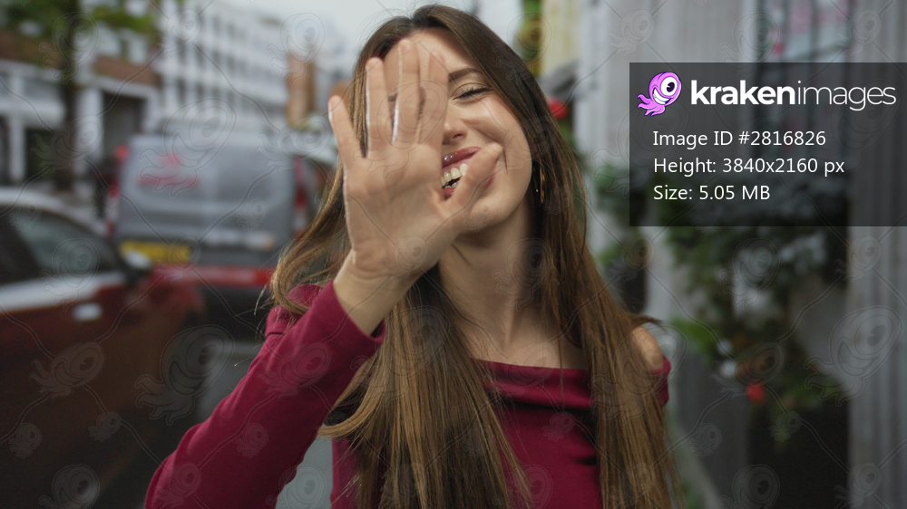 Young hispanic woman wearing a burgundy top covers face with hand and smiles on bustling street; shyness.