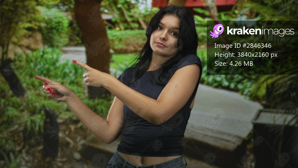 Young hispanic woman wearing a dark top with finger pointing to object on a forest path; guidance direction exploration discovery.