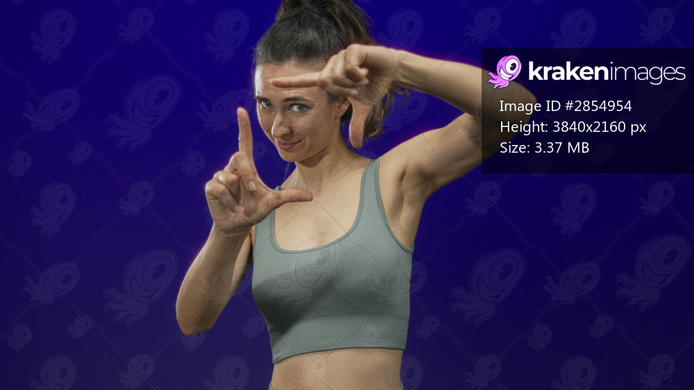 Young hispanic woman wearing a grey crop top frames bare midriff with fingers in deep blue studio; playful creativity.