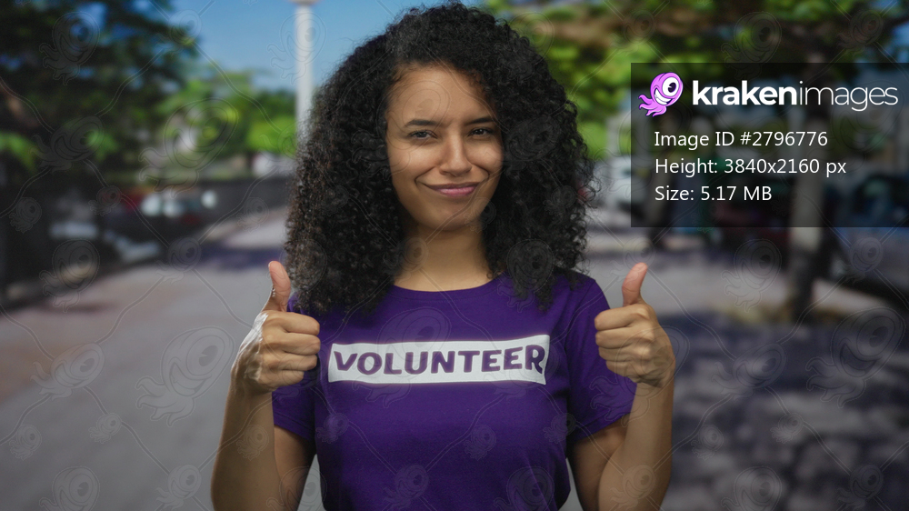 Young hispanic woman wearing a purple volunteer shirt giving double thumbs up on street; optimism community service spirit.
