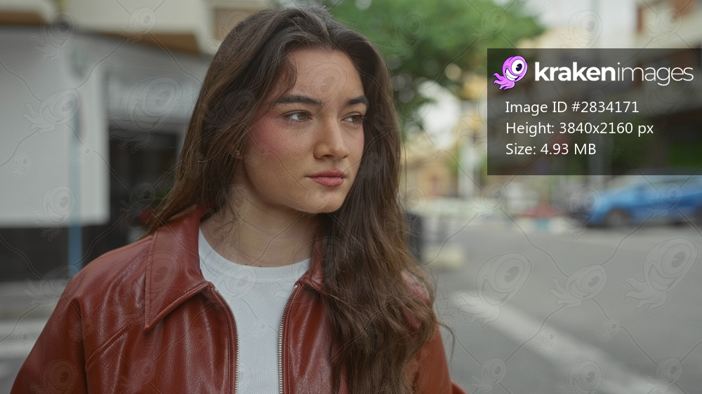 Young hispanic woman wearing a red leather jacket stands gazing sideways on a city street; calm reflection.